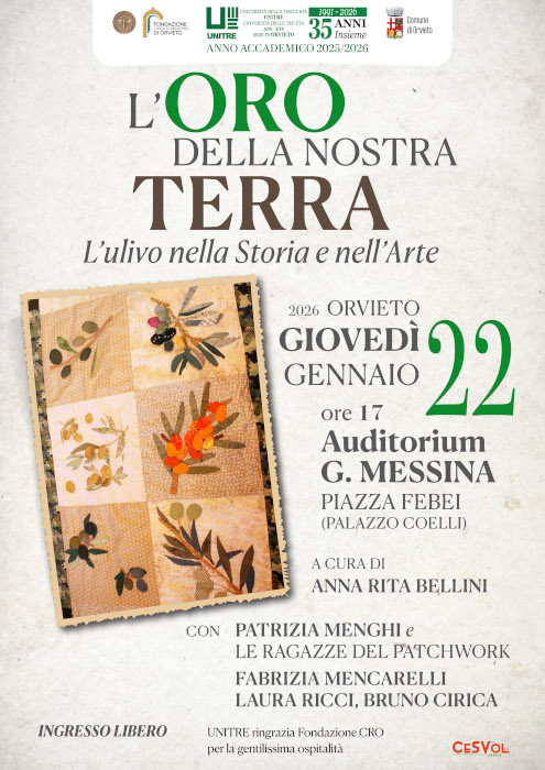 UNITRE organizza l’evento “L’ORO DELLA NOSTRA TERRA. L’ulivo nella Storia e nell’Arte”, ispirato a un drappo artistico creato dal Laboratorio di Patchwork guidato da Patrizia Menghi. Ingresso libero per la cittadinanza; interventi a cura della Prof.ssa Anna Rita Bellini con partecipazione di Patchwork, Laura Ricci, Fabrizia Mencarelli e Bruno Cirica.