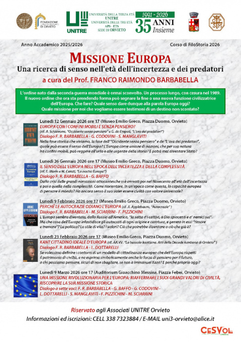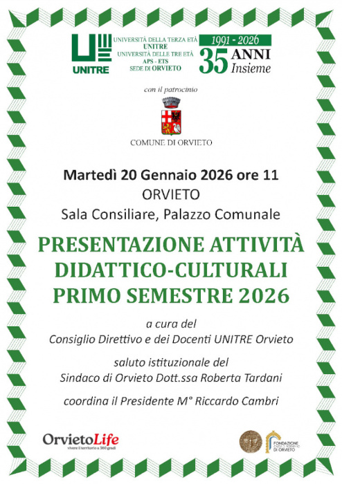 L’UNITRE – Università delle Tre Età di Orvieto rivelerà il calendario didattico-culturale previsto per il primo semestre 2026 nella mattinata di Martedì 20 Gennaio alle ore 11, presso la Sala Consiliare del Comune di Orvieto.