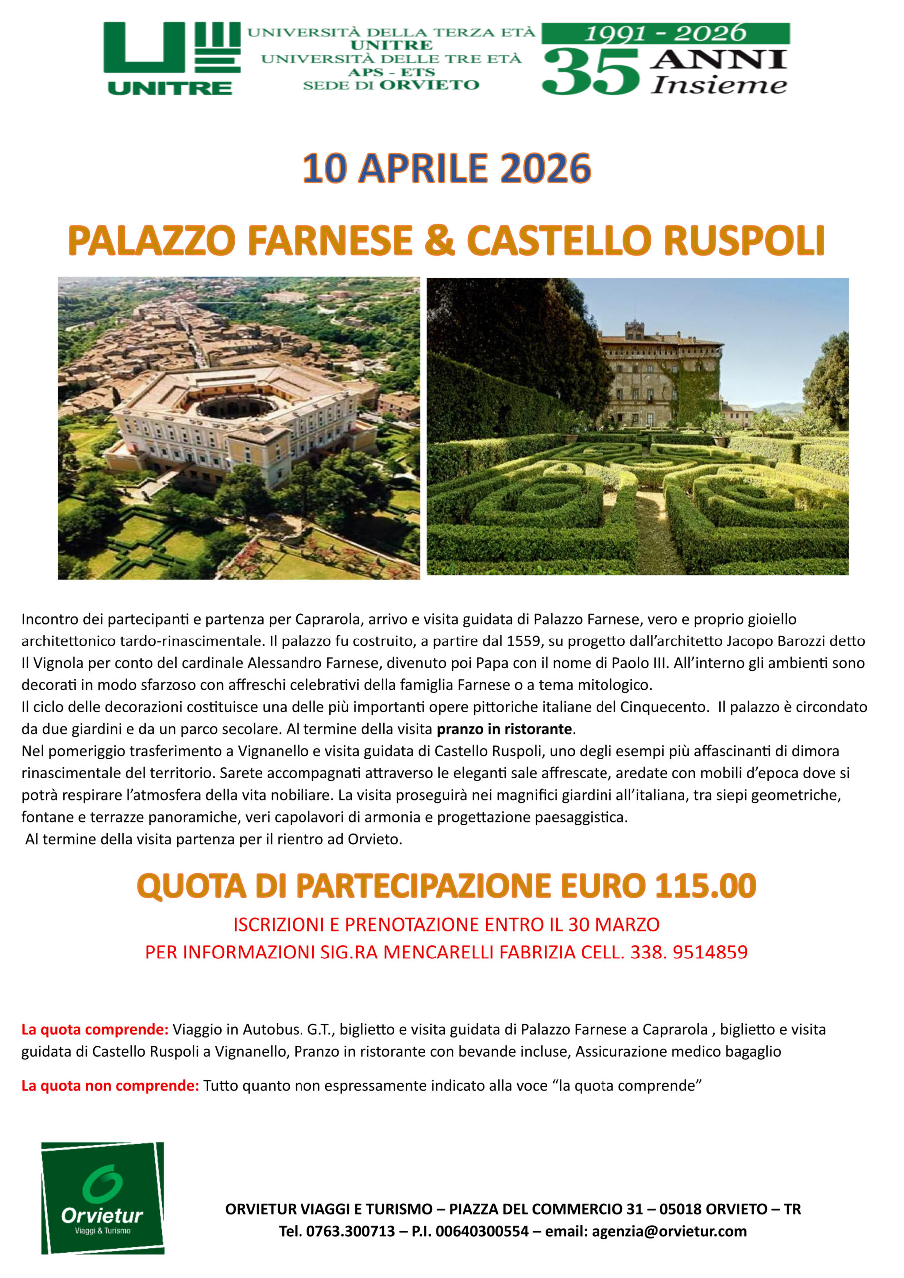 organizzazione OrvieTour Viaggi e Turismo (informazioni e prenotazioni Sig.ra Fabrizia Mencarelli: cell 338 9514859)