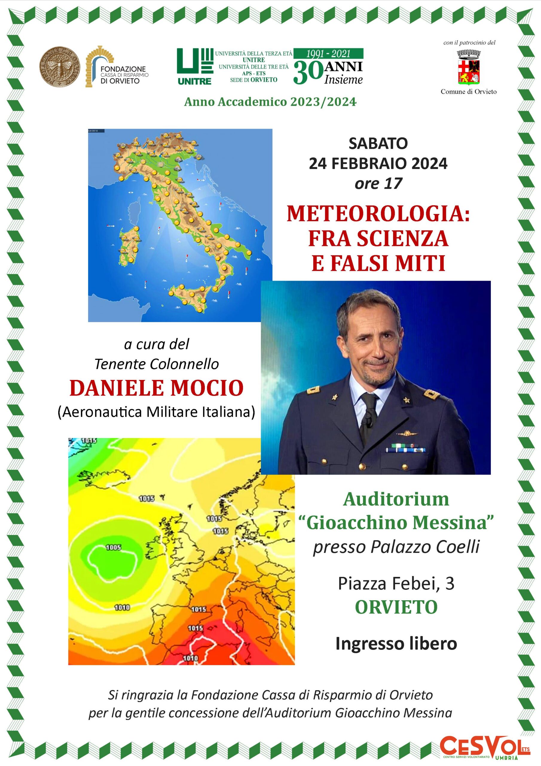 Di grande prestigio il relatore incaricato: il Tenente Colonnello Daniele Mocio, Aeronautica Militare Italiana, uno dei volti televisivi più noti per quanto riguarda le previsioni meteo e gli approfondimenti climatici, storico amico dell’Unitre di Orvieto con la quale ha collaborato varie volte nel recente passato.