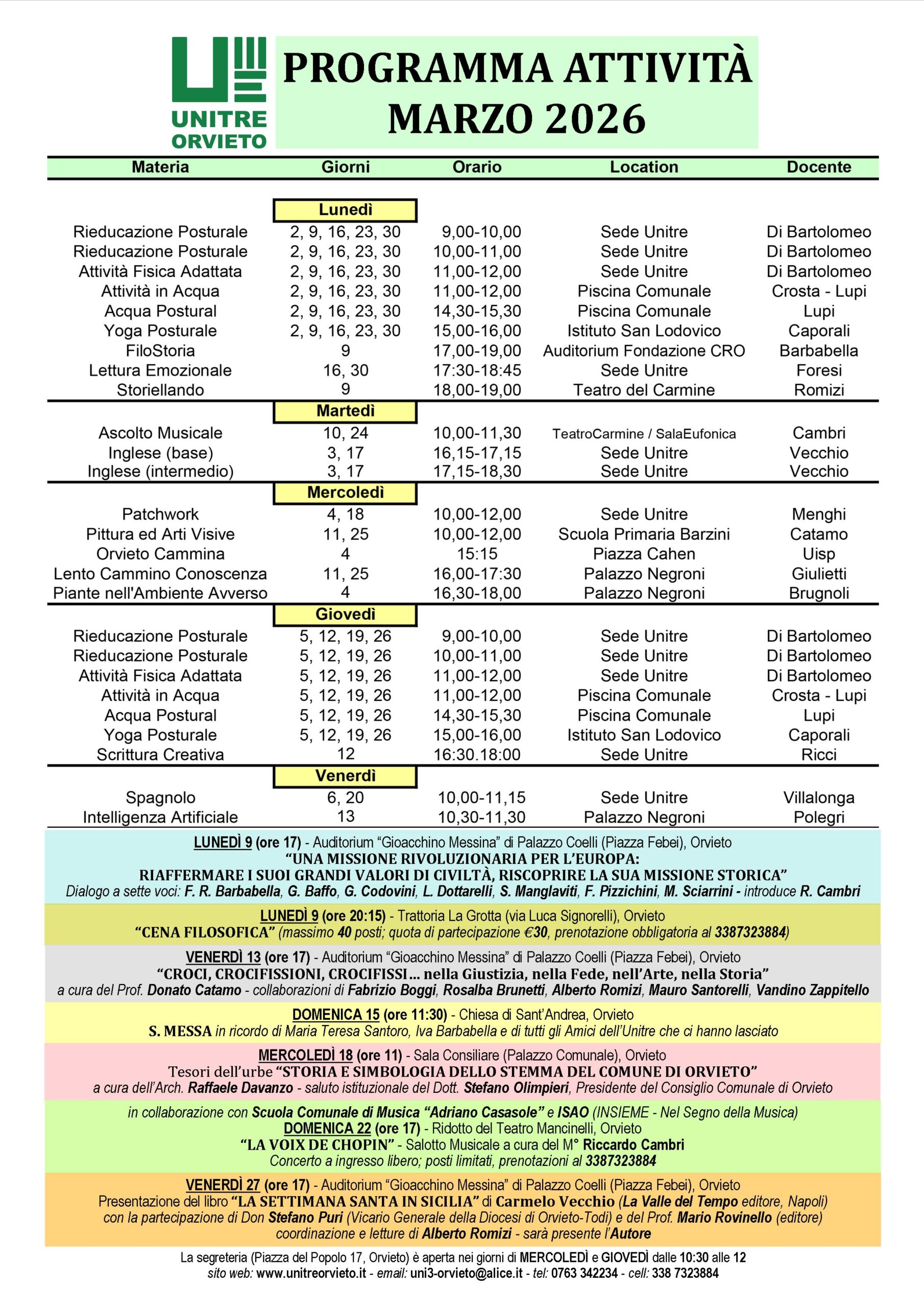 L’imminente primavera regala, all’UNITRE di Orvieto, una rigogliosa programmazione culturale nel mese di Marzo 2026.